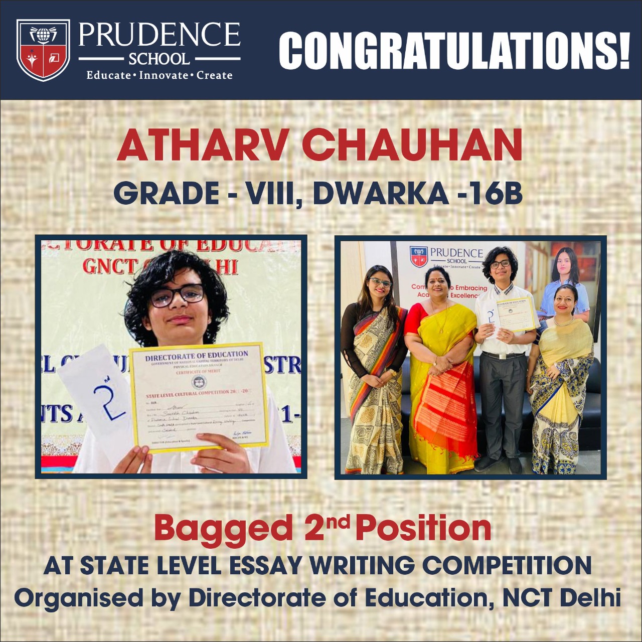 Atharv Chauhan of VIII bagged 2nd position at State Level Essay Writing Competition...