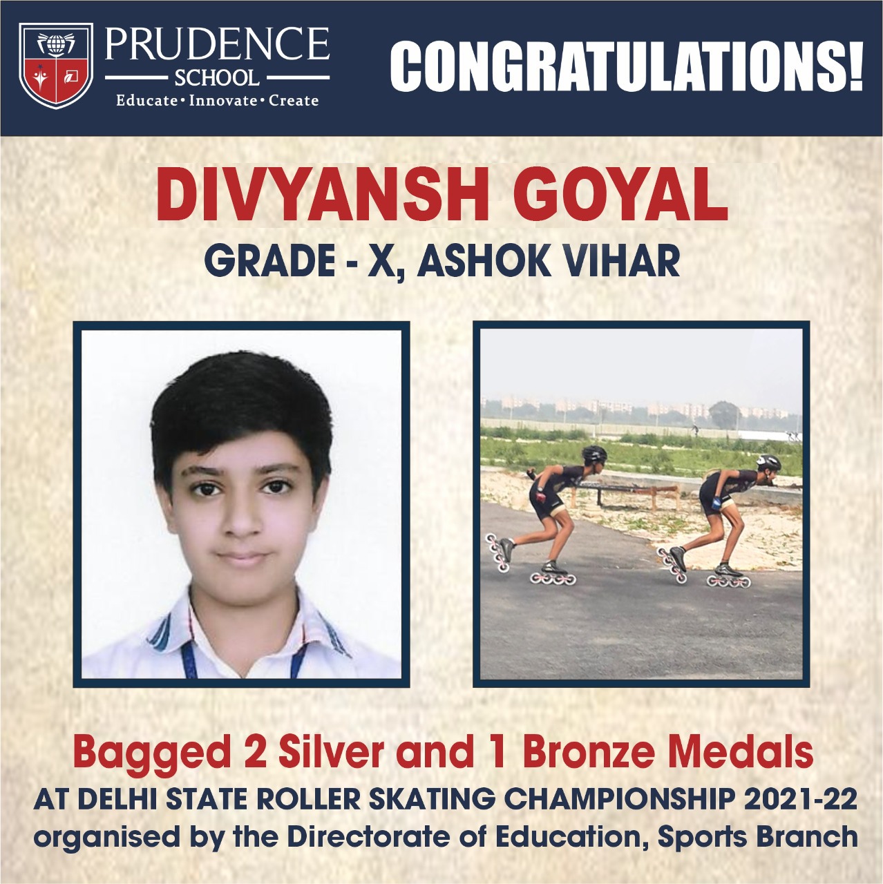 Divyansh Goyal of Grade - X Prudence Ashok Vihar Bagged 2 Silver and 1 Bronze Medals at Delhi state roller skating championship 2021-22