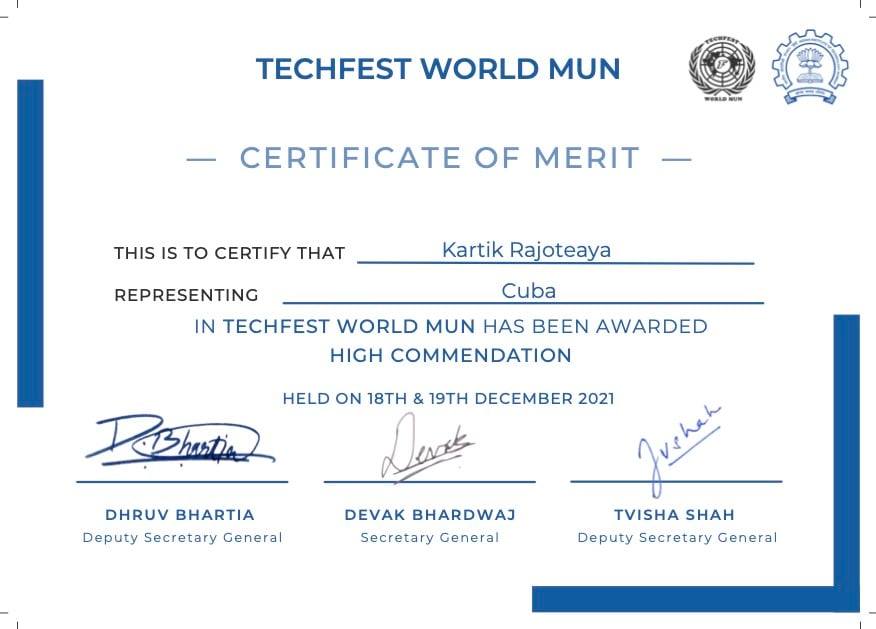 Read MoreHigh Commendation Award’ in IIT Bombay’s Techfest World MUN 2021.