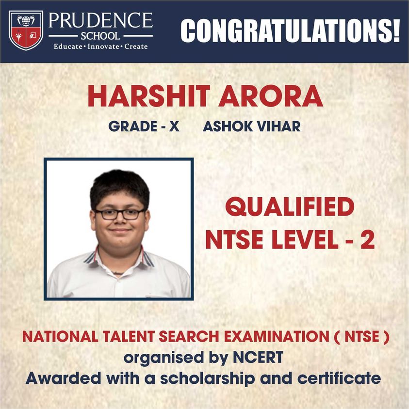 Congratulations to Harshit Arora of Prudence School Ashok Vihar, Grade X for qualifying NTSE Level-2......