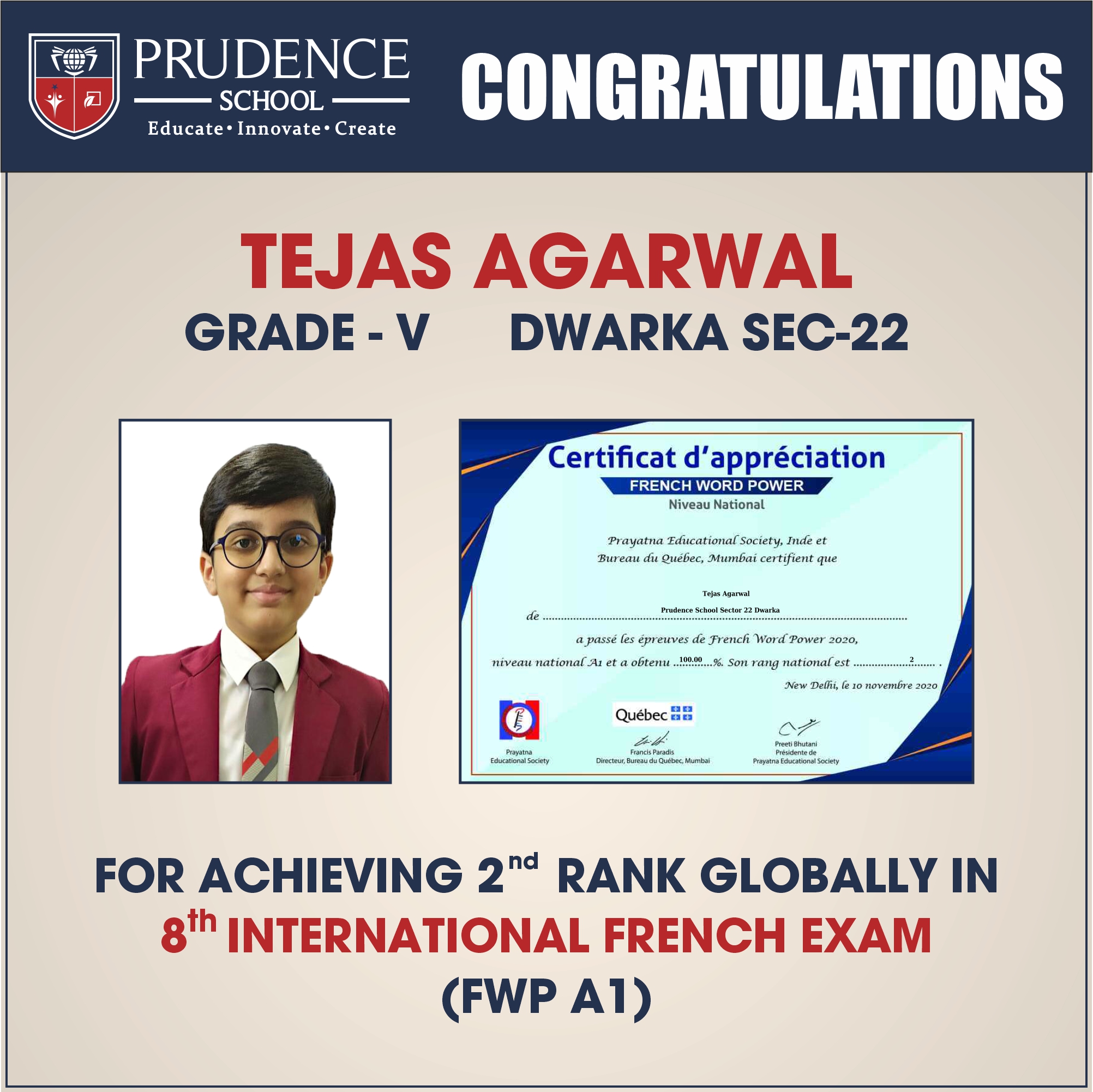 Congratulations to Tejas Agarwal of Prudence School, Dwarka Sector - 22 for achieving 2nd Rank Globa......